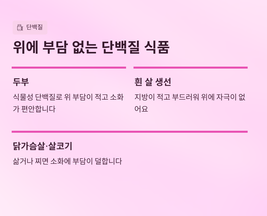 단백질은 우리 몸의 회복과 재생에 필수지만, 기름진 고기는 자극이 될 수 있어요.