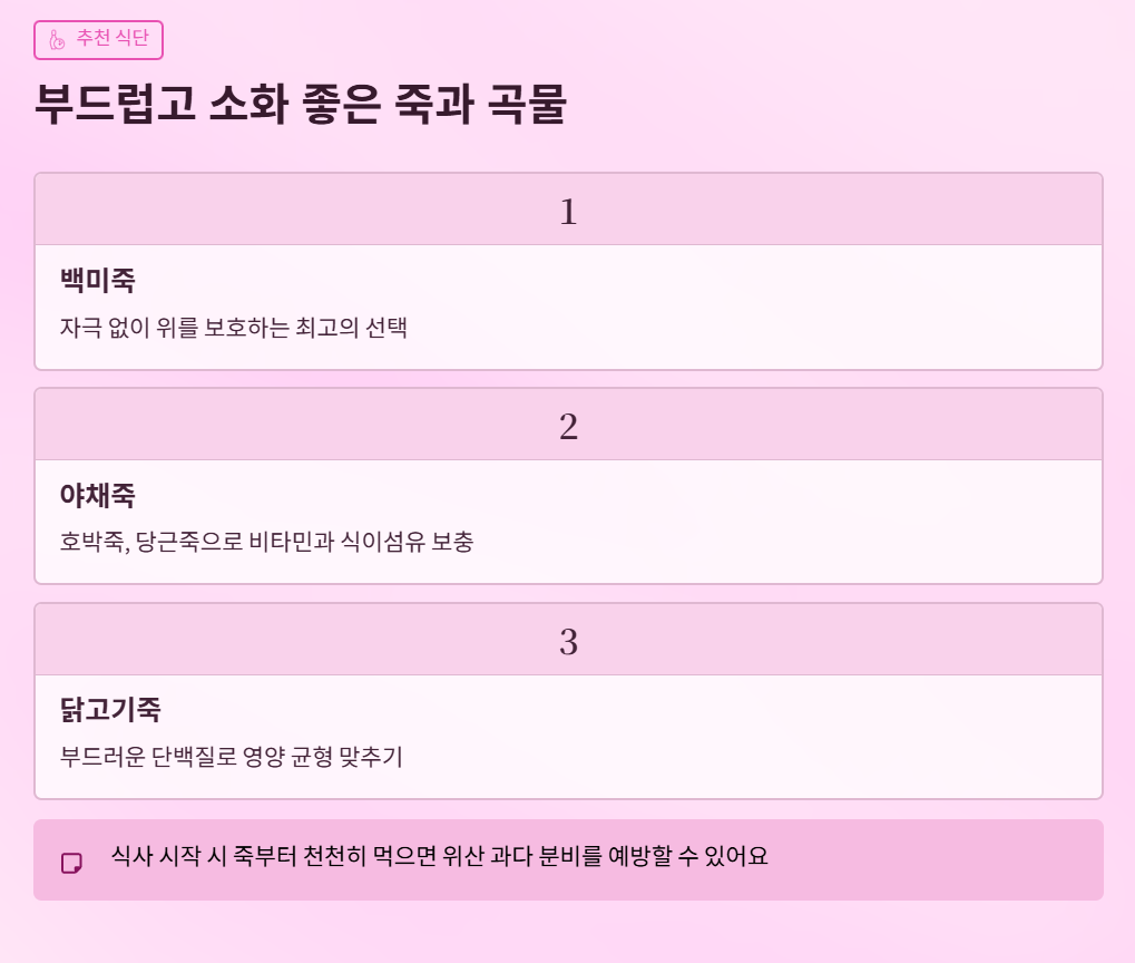👉 특히 식사 시작 시 죽부터 천천히 먹는 습관은 위산 과다 분비를 예방해 줍니다.