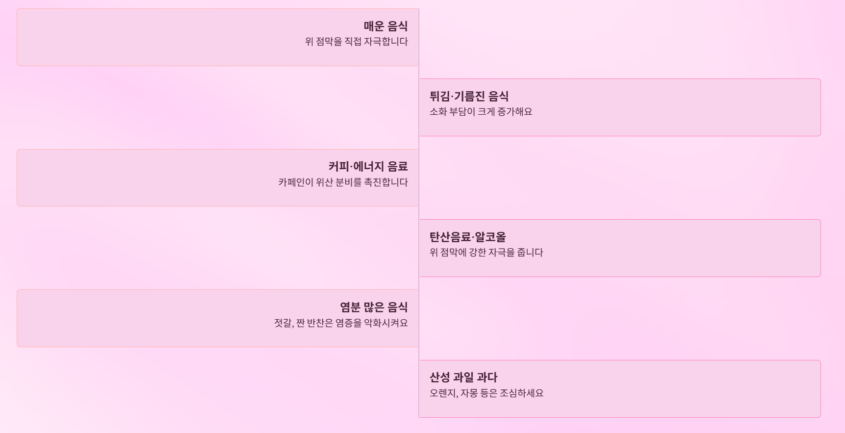 위염 증상을 악화시키는 자극 음식은 가능한 한 줄여야 해요.