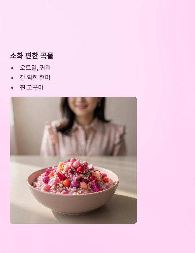 곡물은 에너지의 기본이지만, 위가 예민할 때는 부드럽게 조리한 형태로 먹는 것이 좋아요.