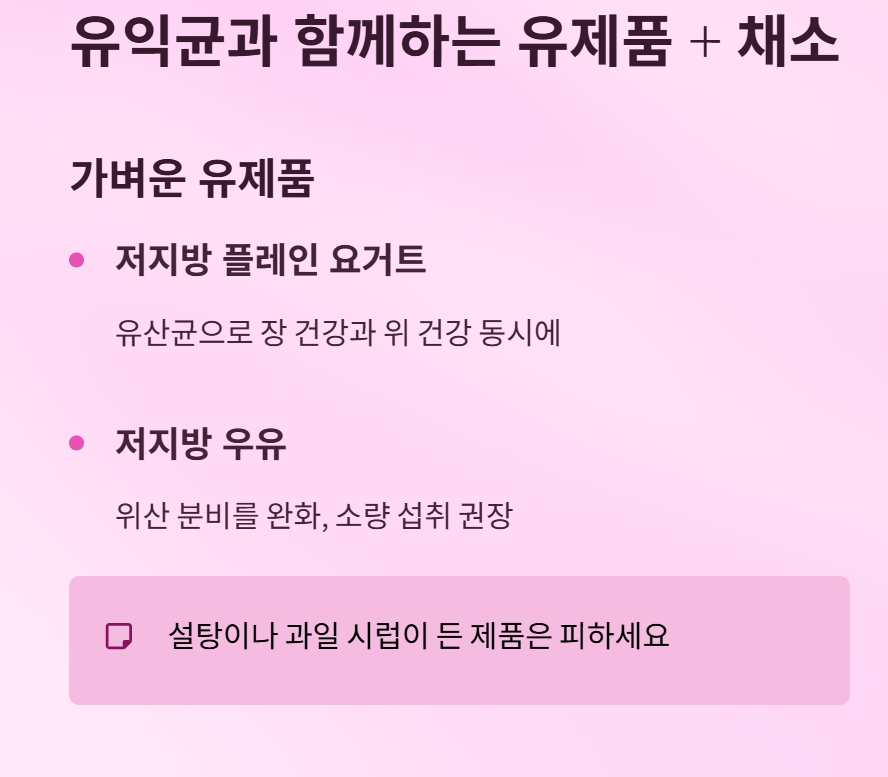 - 저지방 우유: 위산 분비를 완화할 수 있어 상황에 따라 소량 섭취